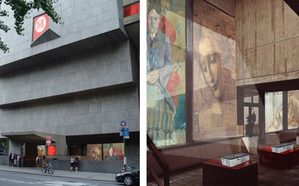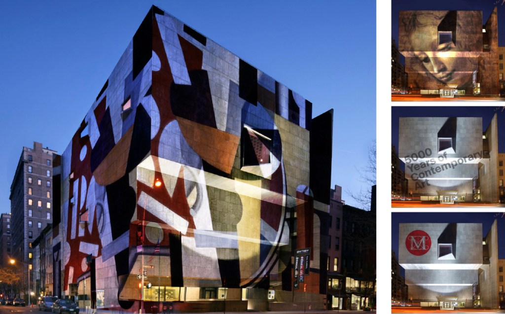 Project artwork from inside the Breuer Building out to Madison Avenue. Works could be from The Artists’ Project, the Met’s web initiative featuring 100 contemporary arts sharing how the Met has influenced them.