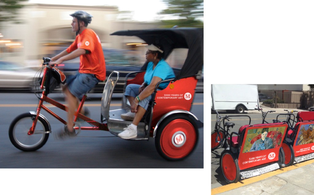 As a promotional and viral social media opportunity, Met directors, artists, and/or celebrity supporters of The Met could ride in the pedicab at featured times with patrons. Rides could even be offered as auction items (“Bid for a ride to The Breuer with Hugh Jackman!”).